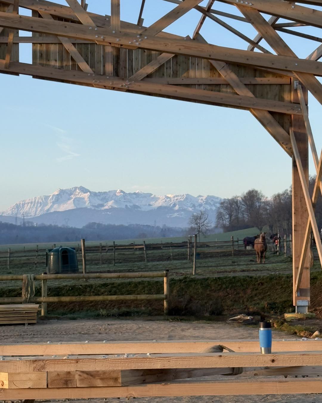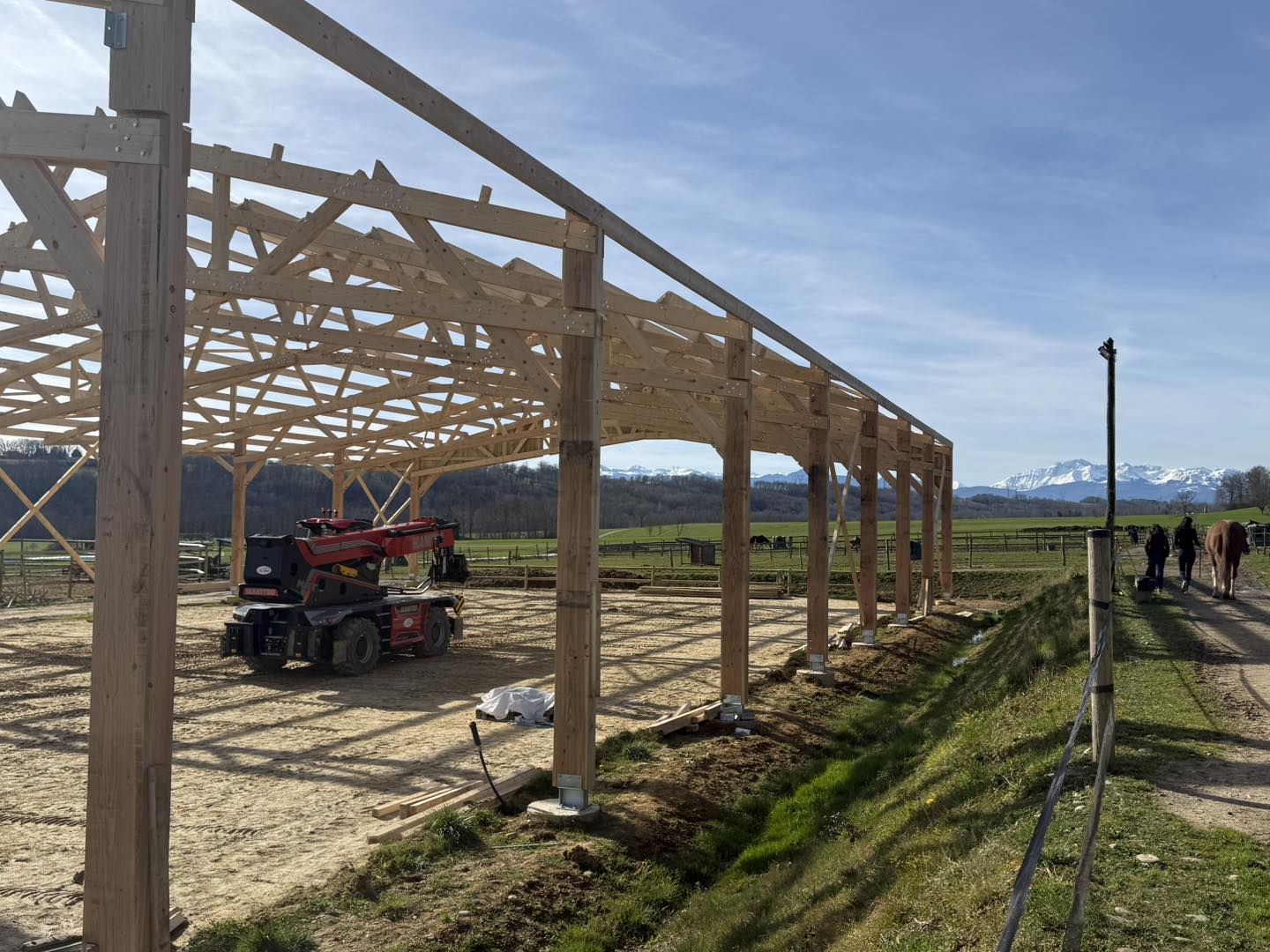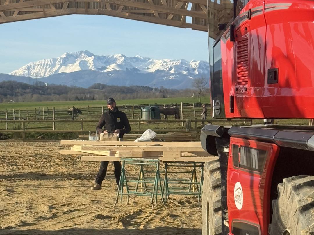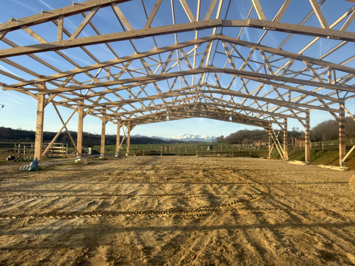 ✔ Réalisations : Dans un cadre exceptionnel face aux sommets enneigés des Pyrénées, nous avons réalisé la pose d’un manège équestre en structure bois.