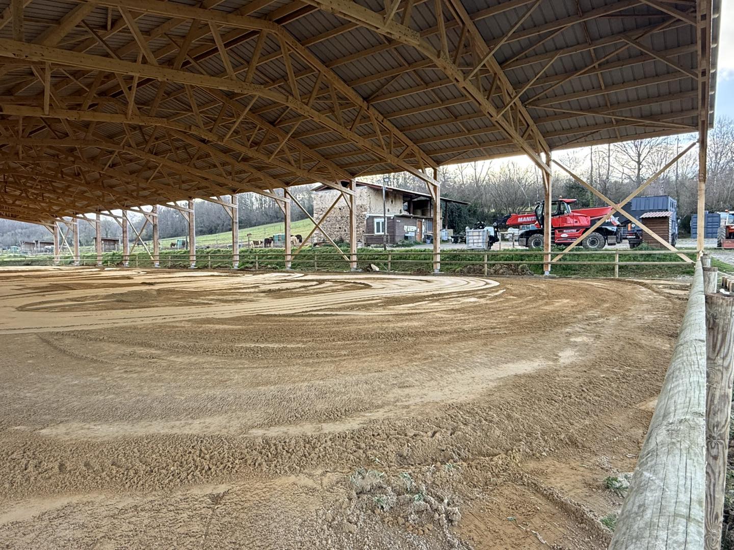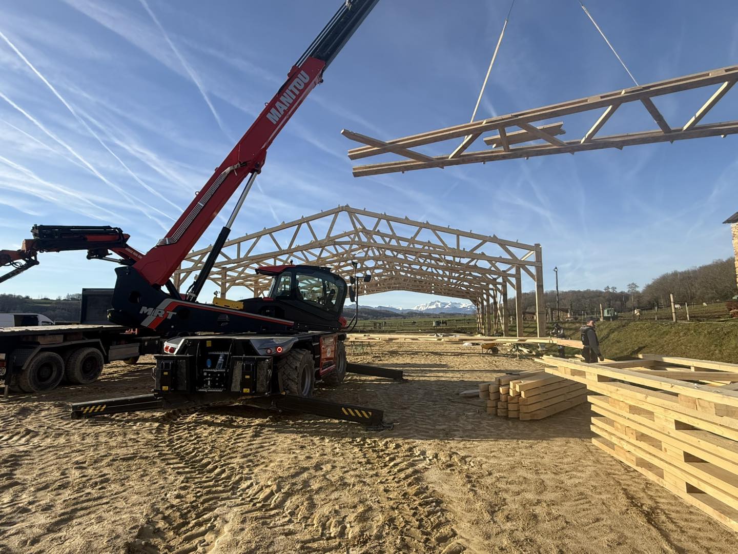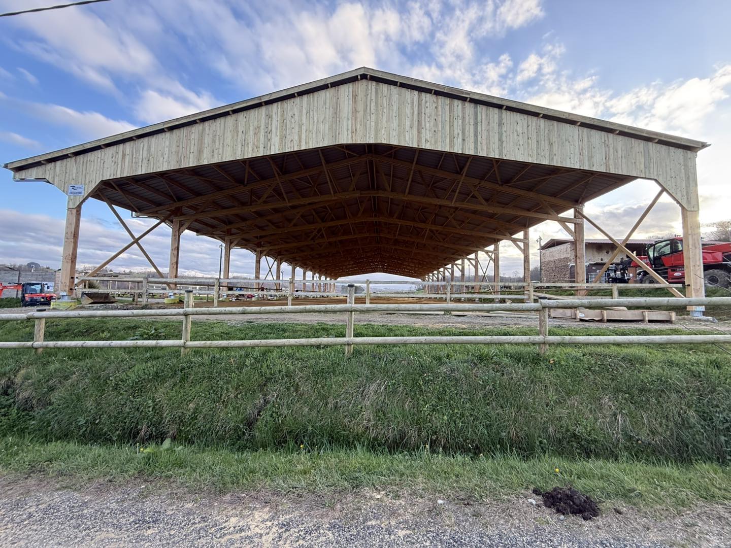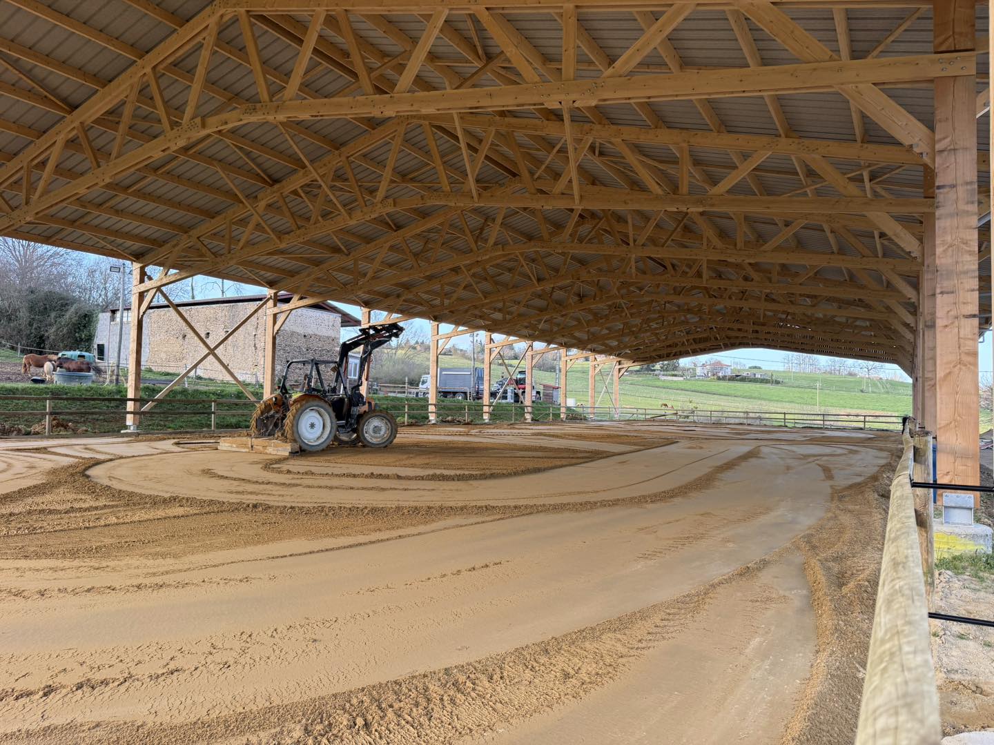 ✔ Réalisations : Dans un cadre exceptionnel face aux sommets enneigés des Pyrénées, nous avons réalisé la pose d’un manège équestre en structure bois.